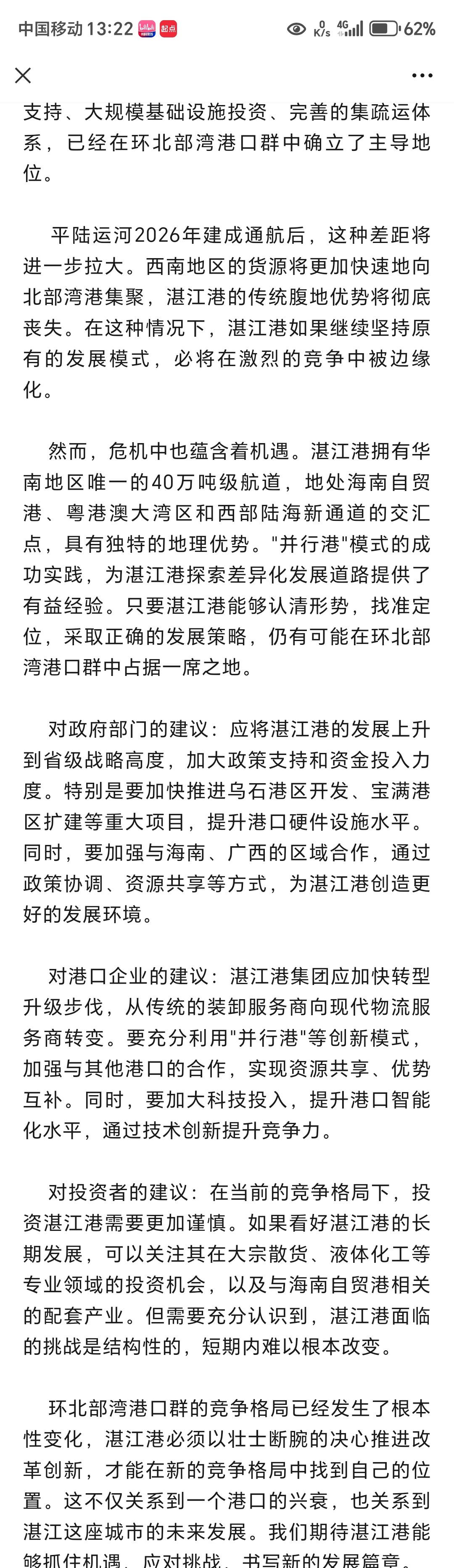 我觉得你们湛江网友还是应该要看一下这篇文章,文章详细对比了三港的各方面,应该是根据网络上的数据综合写的。湛江港不止对北部湾港的竞争没多少优势,就连和洋浦港也有不少劣势。湛江港正面对北部湾港和洋浦港前所未有的冲击挤压,文章建议湛江港应该搞差异化发展