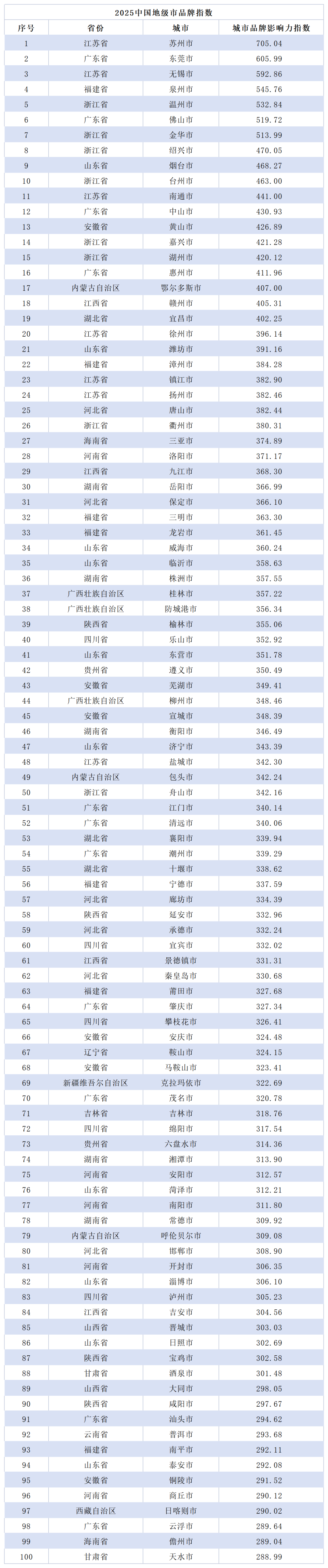 12月6日,2025城市品牌论坛在人民日报社举行,国家相关部委领导、地方主管部门代表以及来自高校、研究机构的专家学者等出席会议。会上发布了2025全国地级市城市品牌指数(不含省会以上城市)前100名城市名单,为各城市高质量发展树立鲜明导向。